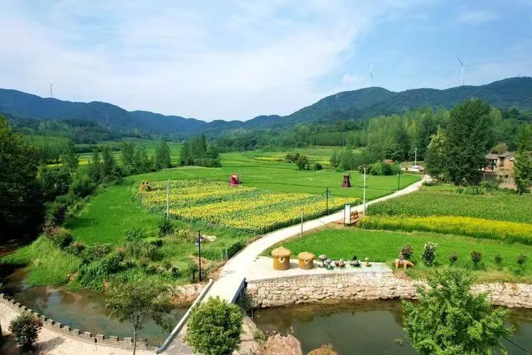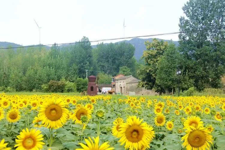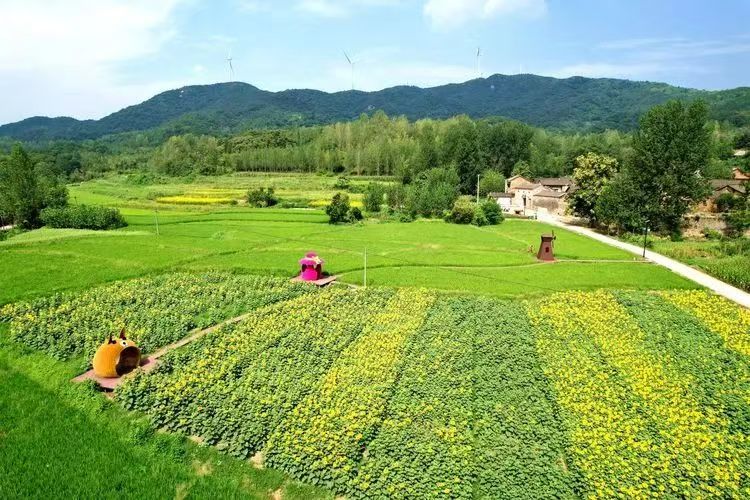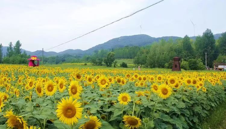 村寨仿佛被绿意温柔地托在掌心。铺展如茵,稻浪翻涌,一直漫向山脚。最是寨前那一片灼灼的向日葵花田——千万张金黄的脸庞齐刷刷仰望苍穹,追随着太阳行经的轨迹。花海间忽见异趣横生:粉红巨伞般的草帽斜浮于金色波涛之上,憨态可掬的灰兔头帽藏身花丛,还有古拙的风车与饱满的粮垛点缀其间。这些跳脱的色彩撞进满目青翠之中,宛如顽童打翻了调色盘,溅起一簇簇明亮的生机。