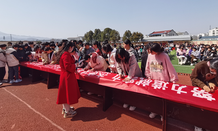由校长和分管教学副校长一起揭示中考100天倒计时牌,并为各班班长分发中考倒计时计时牌,最后,九年级全体同学在各班励志标语横幅上庄严签名,亮明了自己冲刺中考的"军令状"。