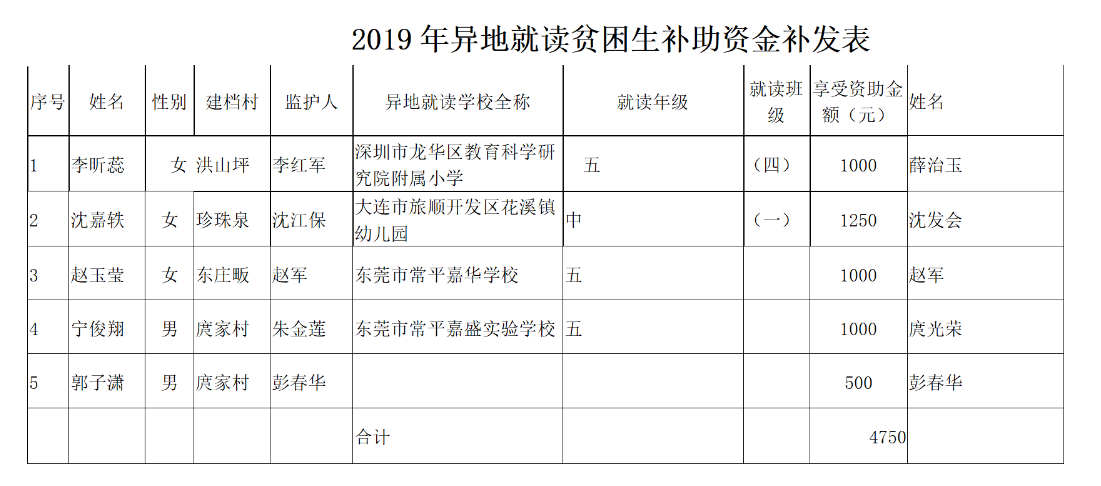 在今年组织的贫困户“两不愁三保障”突出问题排查工作中,发现部分在异地就读的贫困生未落实贫困生寄宿生生活补助,为全面彻底解决贫困户“两不愁三保障”存在的问题,现发放2019年异地就读5名贫困生寄宿生生活补助资金4750元(具体名单附后),现予以公告。