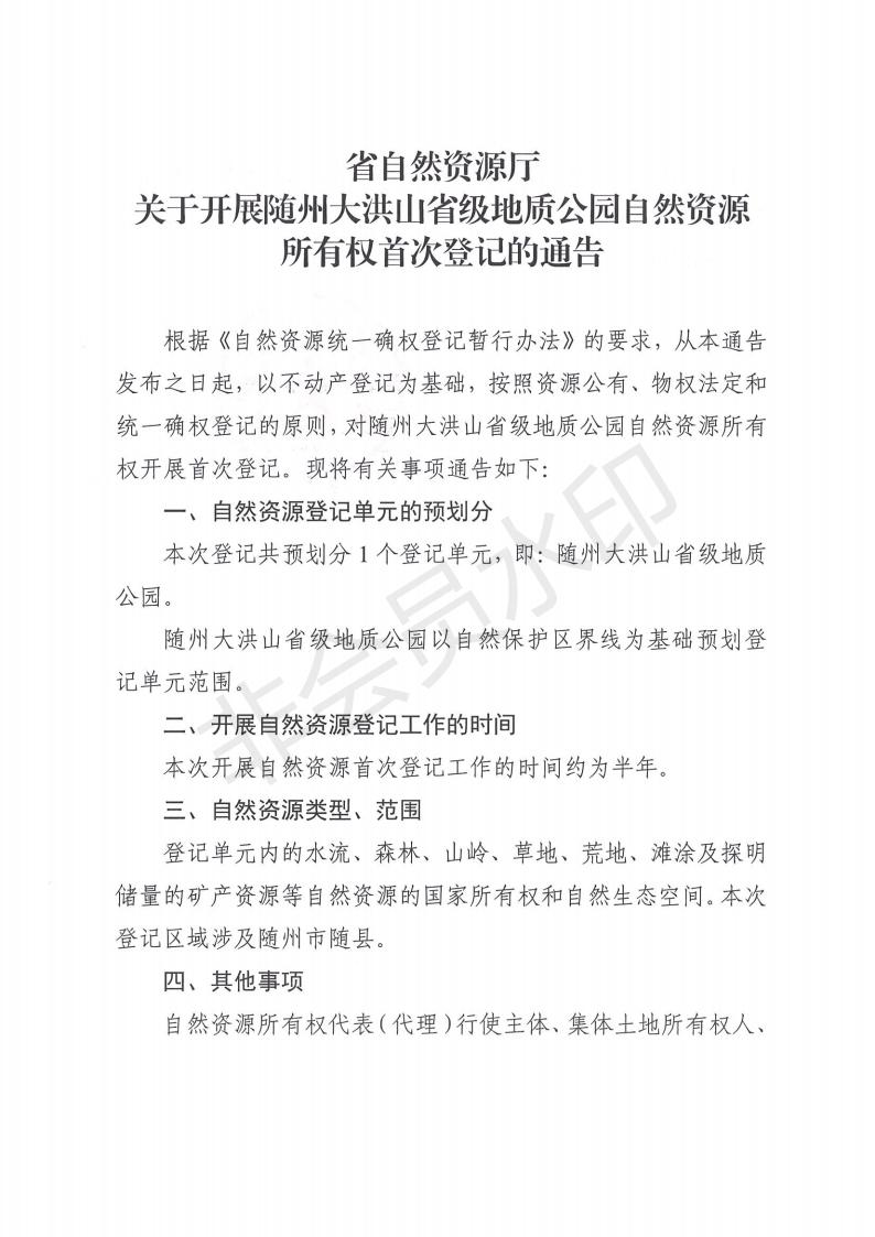 省自然资源厅关于开展随州市大洪山省级地质公园自然资源所有权首次登记的通告