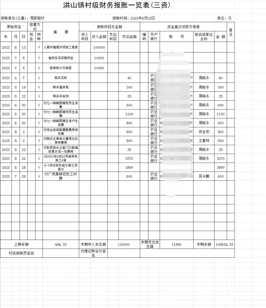 关于洪山镇周家咀村(三资)村级财务报账一览表