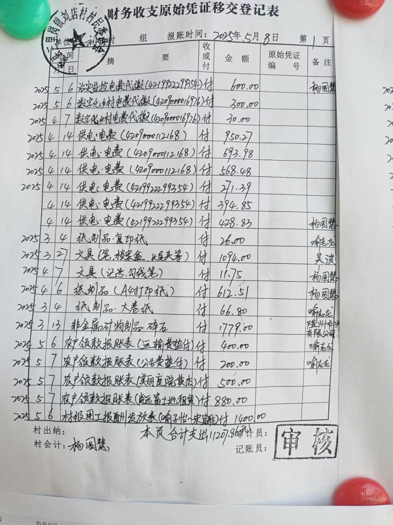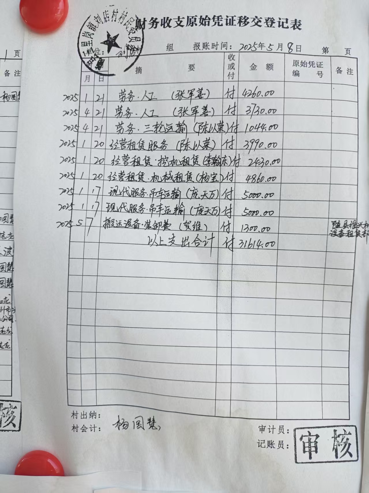 刘店村财务收支原始凭证移交登记表