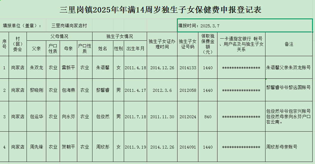 三里岗镇2025年年满14周岁独生子女保健费申报登记表