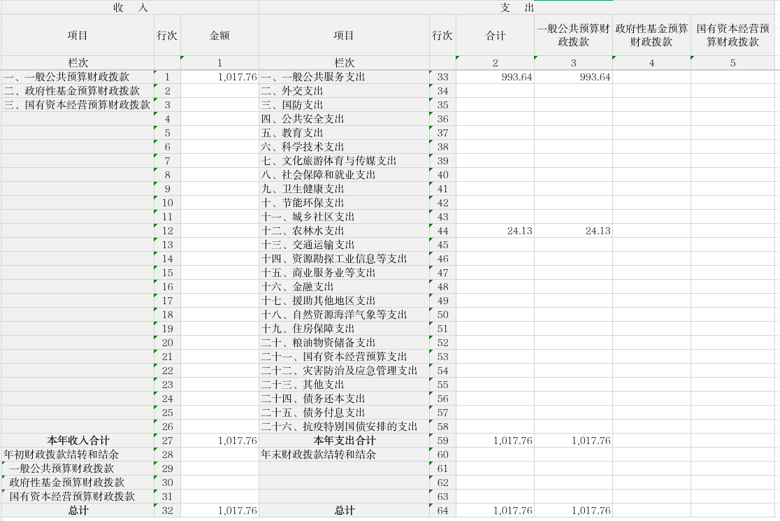 2024年度财政拨款收、支总计均为1017.76万元。与2023年度相比,财政拨款收、支总计各减少861.39万元,下降45.84%。主要原因是人员经费、项目支出减少。