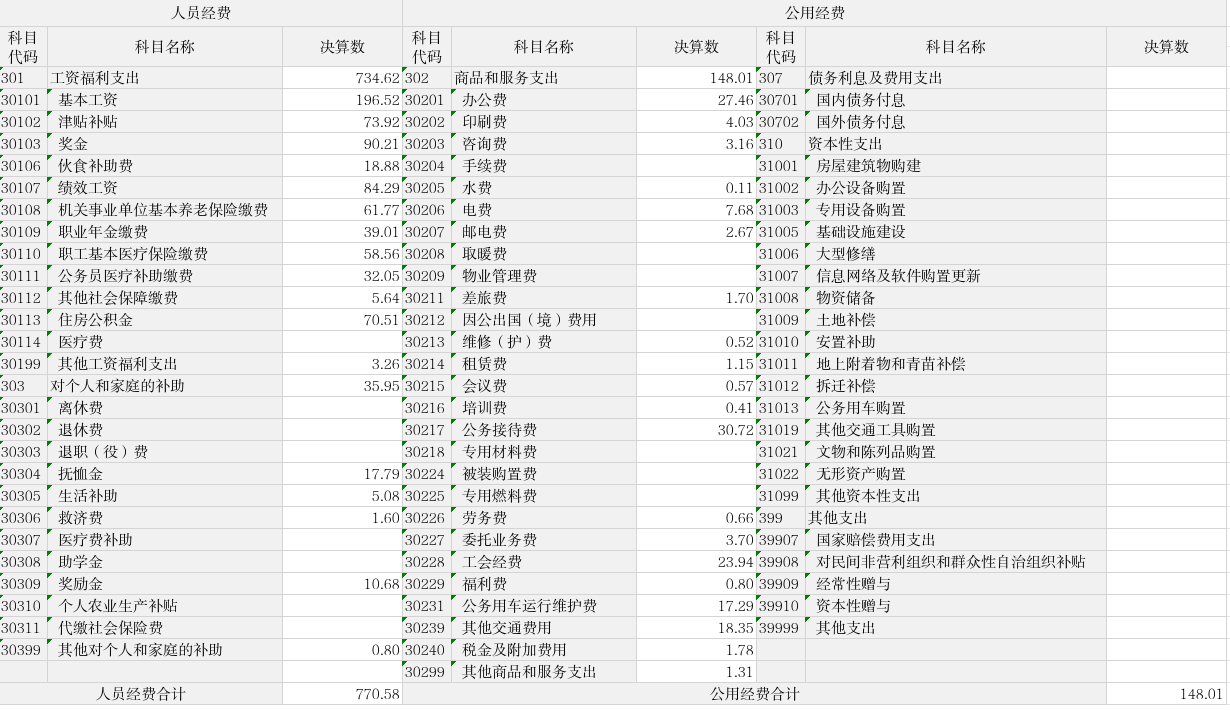 公用经费148.01万元,主要包括:办公费、印刷费、咨询费、手续费、水费、电费、邮电费、取暖费、物业管理费、差旅费、因公出国(境)费用、维修(护)费、租赁费、会议费、培训费、公务接待费、专用材料费、被装购置费、专用燃料费、劳务费、委托业务费、工会经费、福利费、公务用车运行维护费、其他交通费用、税金及附加费用、其他商品和服务支出、办公设备购置、专用设备购置、信息网络及软件购置更新、公务用车购置、其他资本性支出。