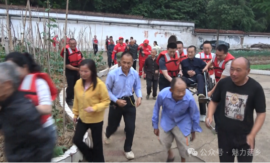 次日晚间,演练场景转移至杨家棚村。面对“河水暴涨倒灌”的紧急情况,各部门分工协作,重点演练该村福利院老人、残障人士等特殊群体的快速转移。救援人员采用背扶、轮椅推送等方式,帮助行动不便者撤离,并安排专人清点人数,确保不落一人。