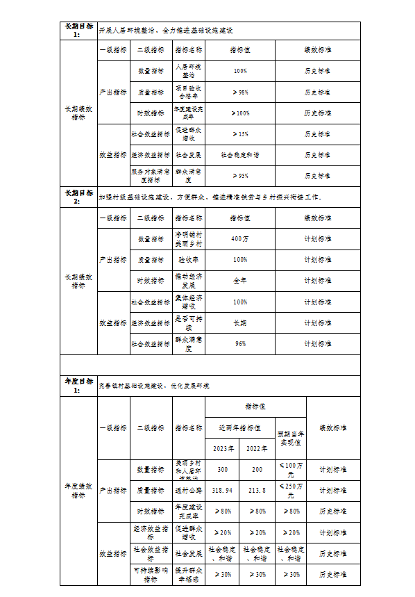 产出指标:美丽乡村和人居环境整治、砂河小流域治理、尚王路建设。项目验收合格率、年度建设完成率达到计划标准。