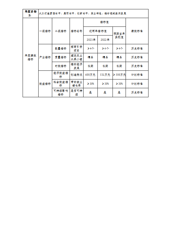 产出指标:服务涵盖20个村;招商引资项目≥4个;建设农业水果小镇达到精品;长期推动经济发展,以上指标设立依据是历史标准、计划指标。