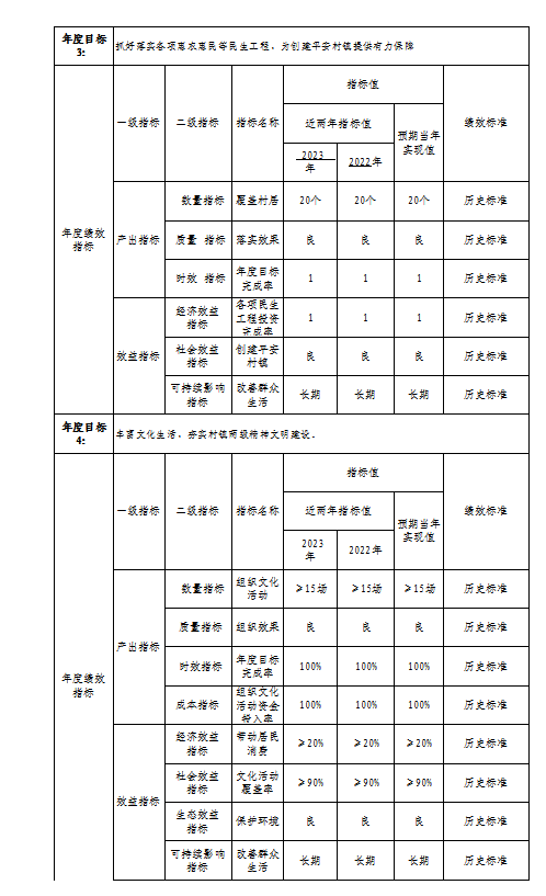 效益指标:各项民生工程投资完成率100%;创建平安村镇;维护生态平衡;改善群众生活,以上指标设立依据是计划标准。