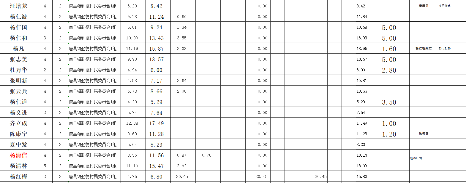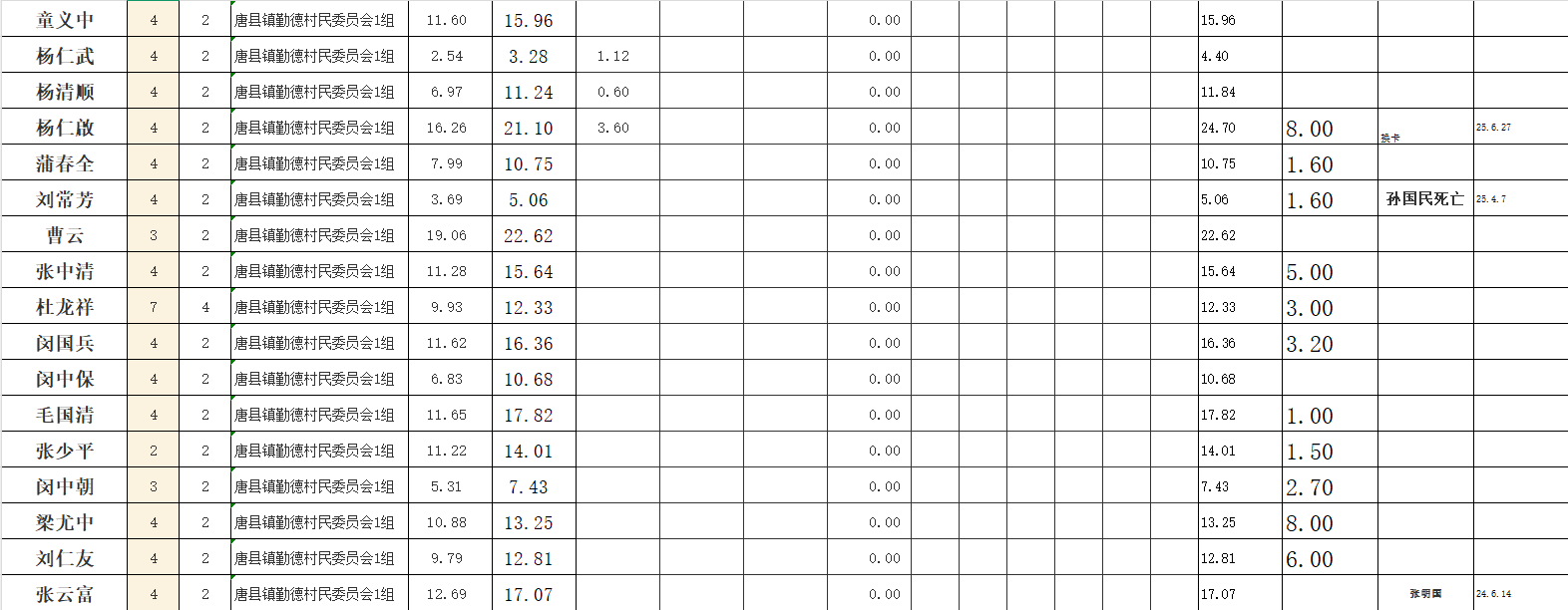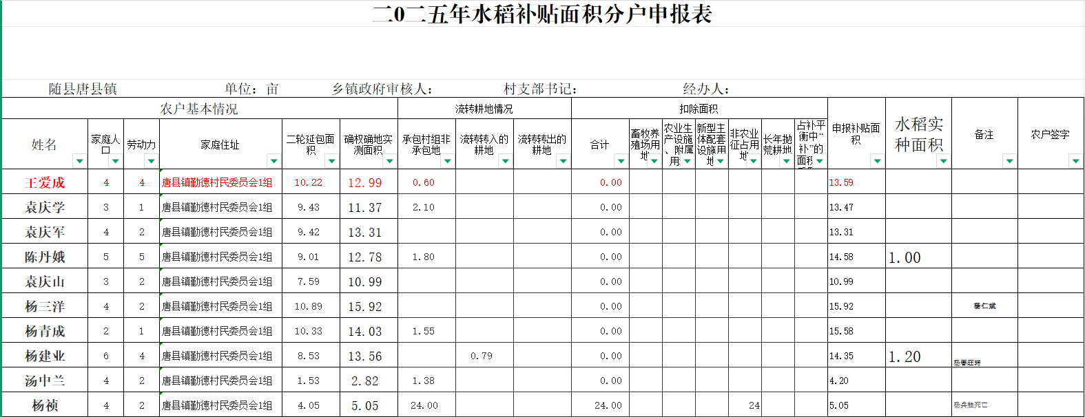 唐县镇勤德村(2025)水稻面积申报表(节选)