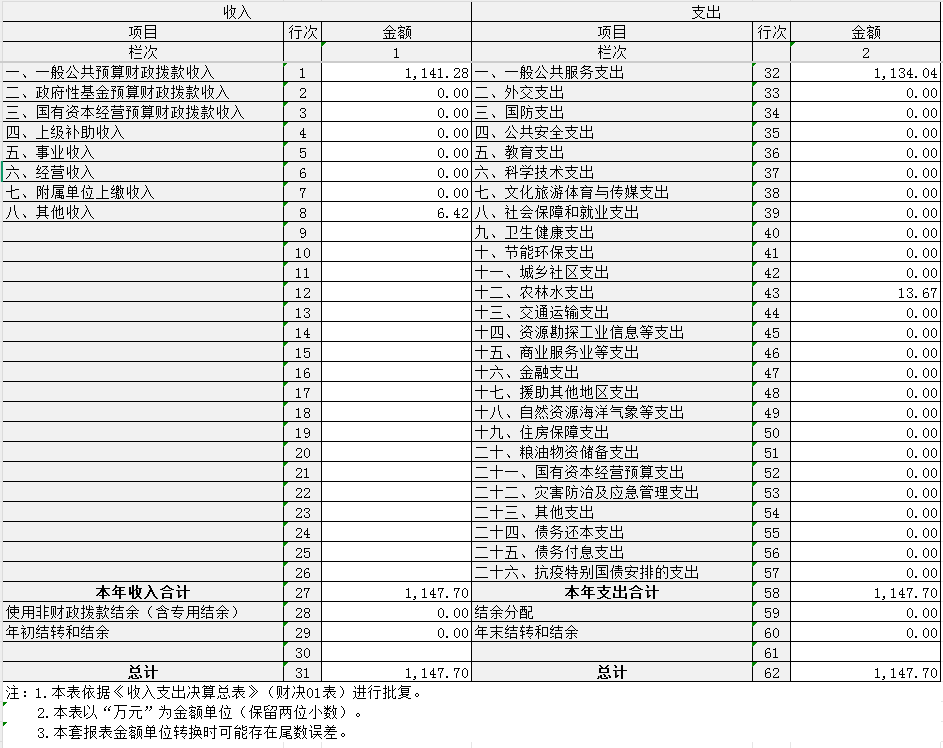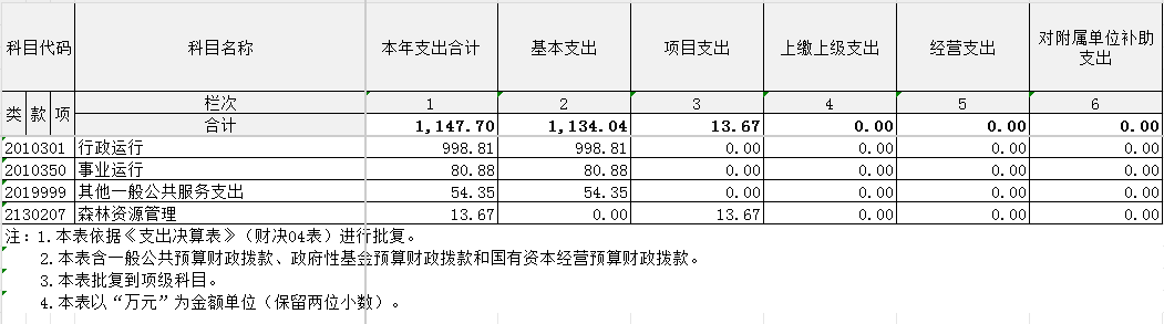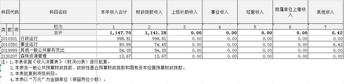 2024年度收、支总计均为1147.7万元。与2023年度相比,收、支总计各增加8.06万元,增长0.71%,主要原因是较去年多出森林资源管理类项目支出。