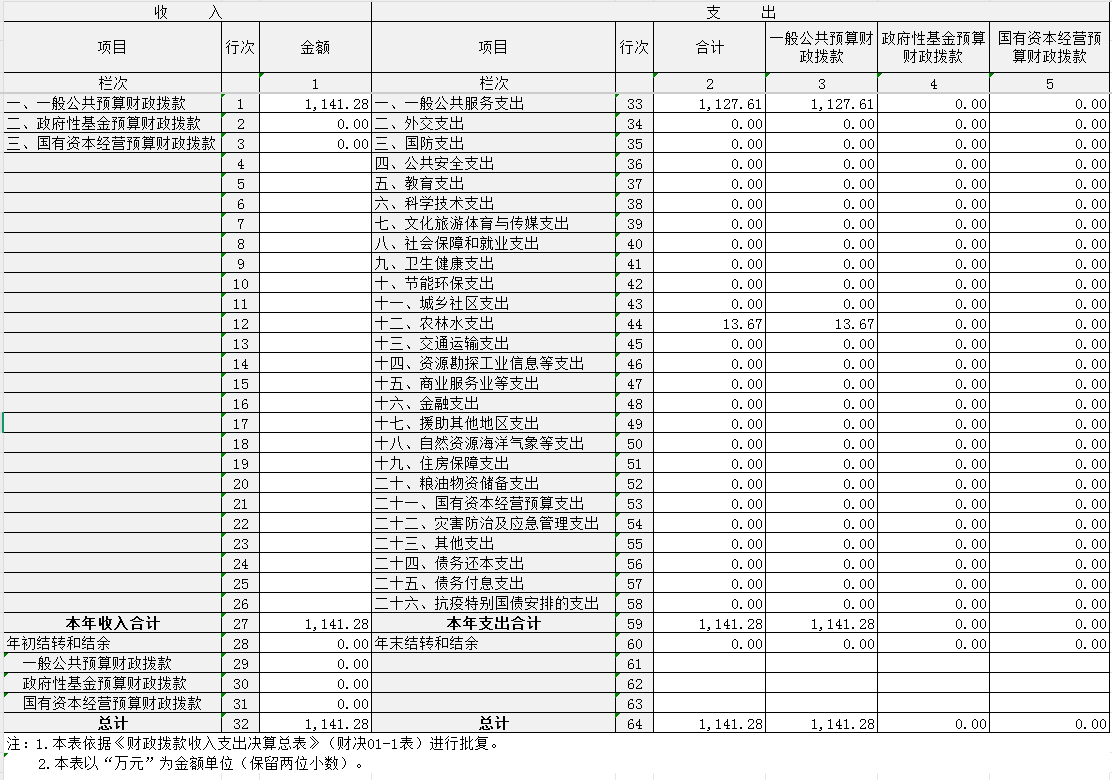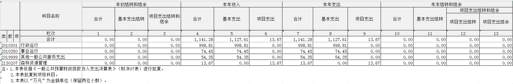 2024年度财政拨款收、支总计均为1141.28万元。与2023年度相比,财政拨款收、支总计各增加1.64万元,增长0.14%。主要原因是较去年多出森林资源管理类项目支出。