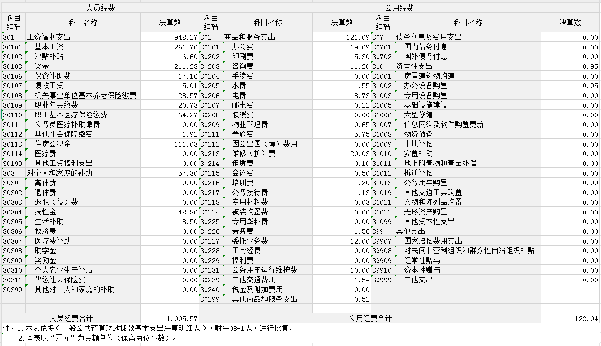 公用经费122.04万元,主要包括:办公费、印刷费、咨询费、手续费、水费、电费、邮电费、取暖费、物业管理费、差旅费、因公出国(境)费用、维修(护)费、租赁费、会议费、培训费、公务接待费、专用材料费、被装购置费、专用燃料费、劳务费、委托业务费、工会经费、福利费、公务用车运行维护费、其他交通费用、税金及附加费用、其他商品和服务支出、办公设备购置、专用设备购置、信息网络及软件购置更新、公务用车购置、其他资本性支出。