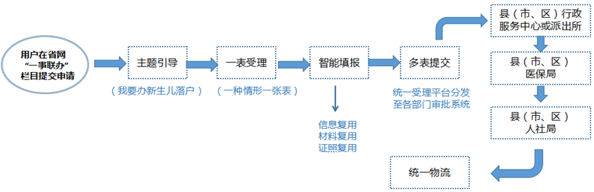 新生儿落户主题由行政相对人在湖北省政务服务网“一事联办”专区,根据页面提示进行一表填报,完成网上申报。办件通过统一受理平台分发至相关职能部门,由行政审批人员进行办理,统一窗口出件。