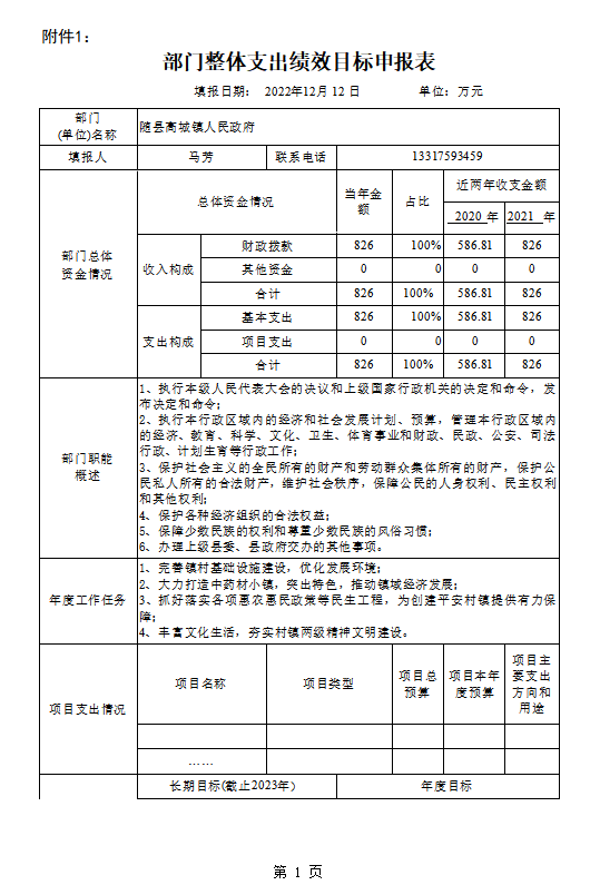 2021年度财政拨款收、支总计均为826万元。与2020年度相比,财政拨款收、支总计各增加239.19万元,增长40.76%。主要原因是:一、按照2021年度预算编报口径,预估填报五项奖工资;二、按照省、市、县统一部署,将2021年度项目支出统一进行了预算。