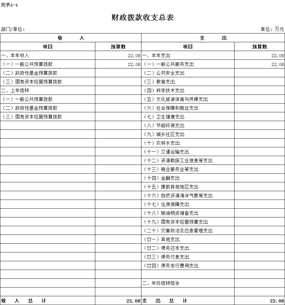 1、本年度收入预算合计22.08万元。其中:一般公共预算拨款收入22.08万元,上年结转结余0万元。